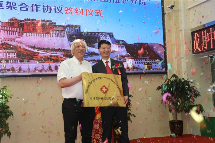 四川省腫瘤醫(yī)院黨委書(shū)記郎錦義,西藏阜康醫(yī)療股份有限公司黨委書(shū)記、董事長(zhǎng)王斌代表雙方共同簽署《川藏區(qū)域共建四川省腫瘤醫(yī)院(集團(tuán))拉薩分院戰(zhàn)略框架合作協(xié)議》,隨后郎錦義書(shū)記向王斌董事長(zhǎng)進(jìn)行了授牌。